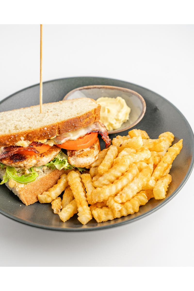 Serverast på heimelaga focachiabrød, chilimajones, salat,tomat,kyllingfilet og bacon.Serverast med pommesfrites eller søtpotet.Allergen: Hvetegluten, Egg, Soya, Melk